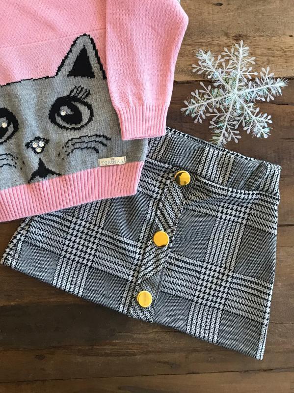 Saia com detalhe de botões decorativos e elástico na cintura. Perfeita para deixar o look ainda mais charmoso! Tamanhos 8/10/12 por R$ 81,90